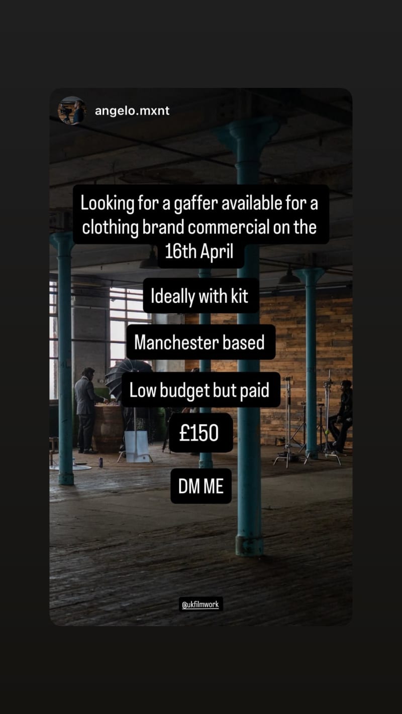 gaffer needed for a clothing brand commercial, ideally manchester-based and with kit. low budget but paid at £150.