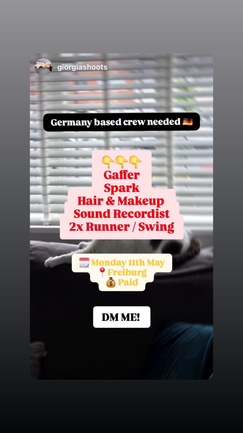 germany-based crew needed for a paid shoot in freiburg. roles needed are gaffer, spark, hair & makeup, sound recordist, and 2 runner/swing.