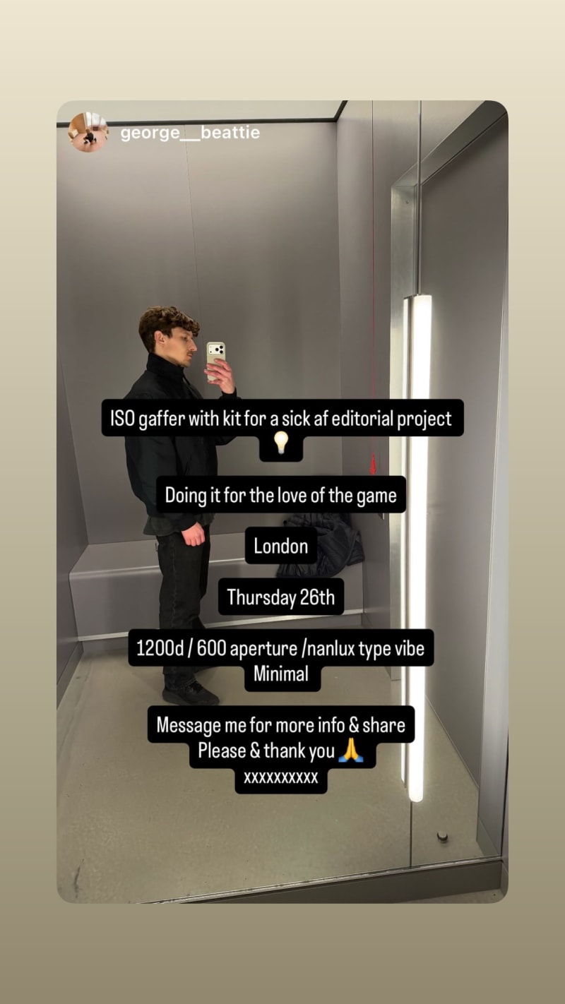 looking for a gaffer with kit for an editorial project in a minimal 1200d / 600 aperture / nanlux style setup. message for more info and share.