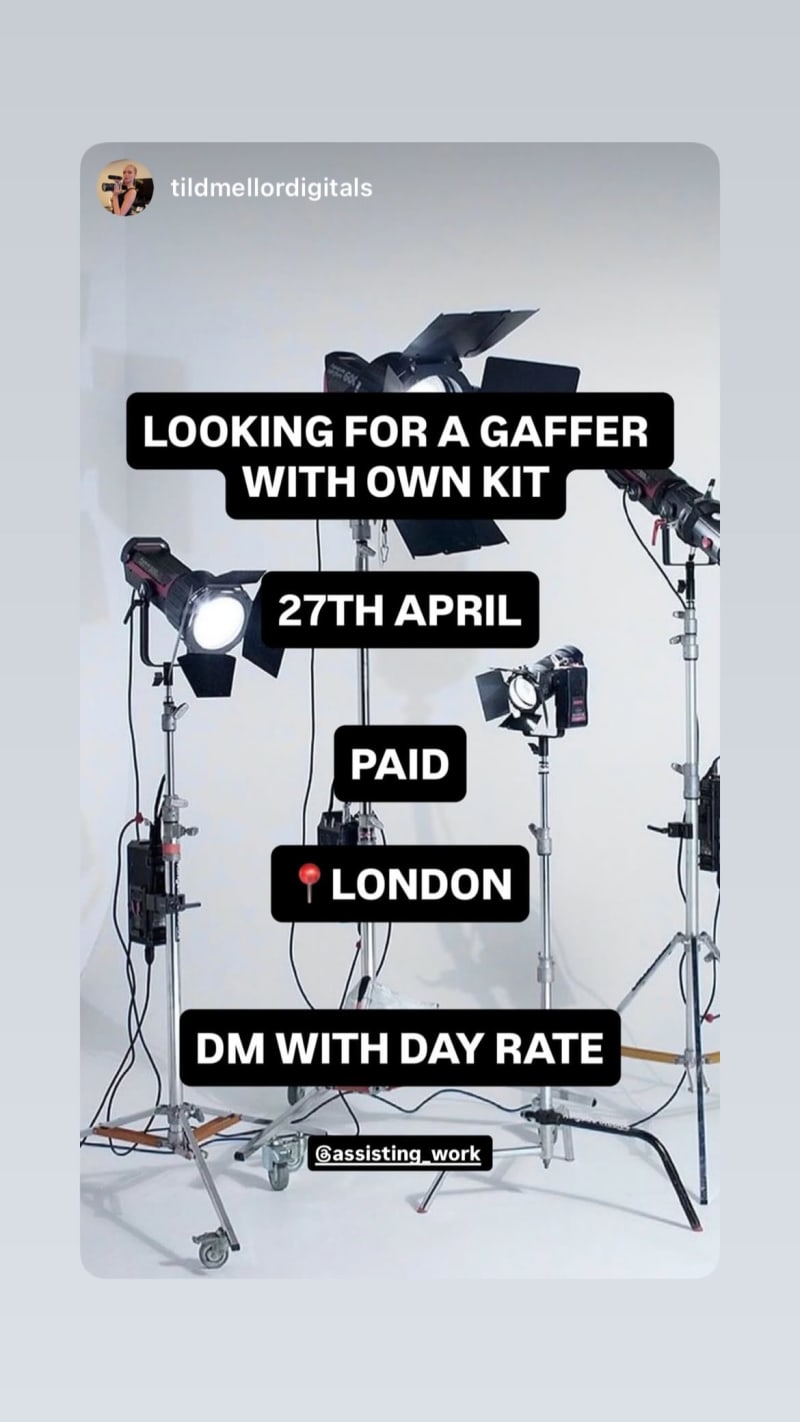 looking for a gaffer with their own kit for a paid job. dm with day rate.