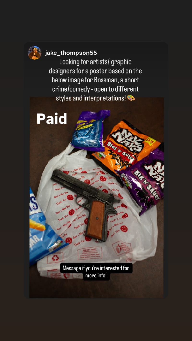 looking for artists/graphic designers to create a poster for "bossman," a short crime/comedy, based on the provided image. open to different styles and interpretations.