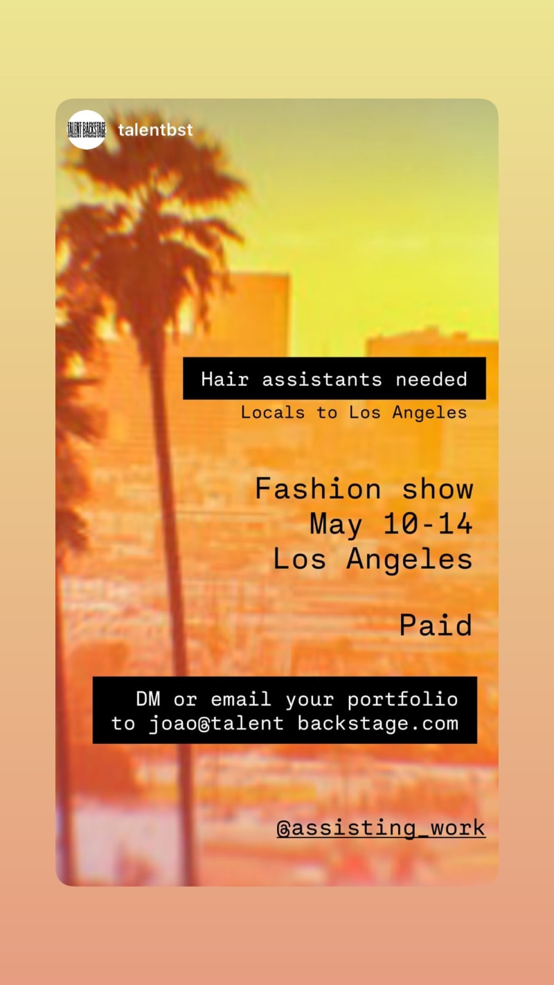 hair assistants needed for a paid fashion show. locals to los angeles should dm or email their portfolio.
