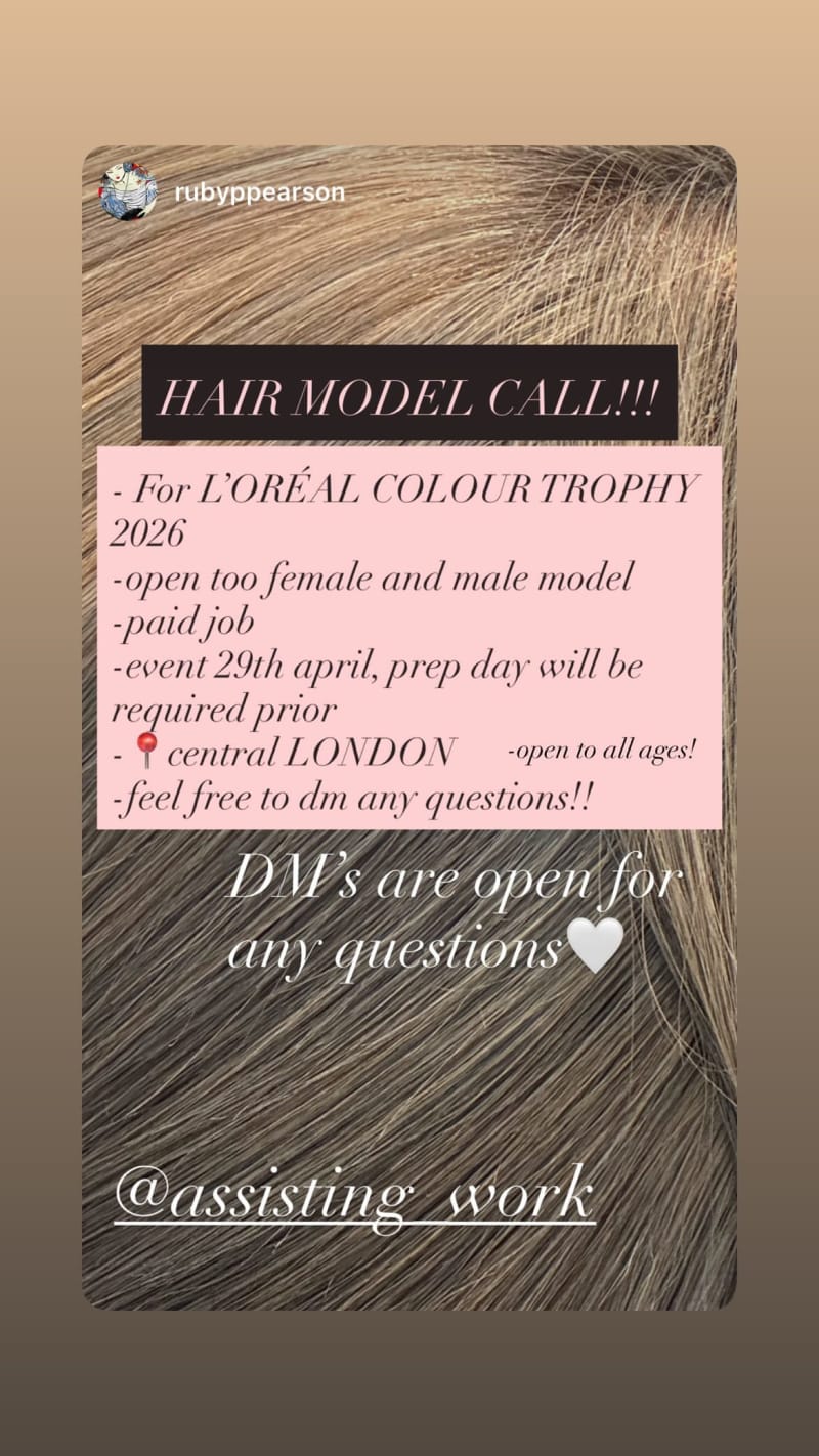 hair model call for l'oréal colour trophy 2026. open to female and male models of all ages for a paid event, with a prep day required beforehand.