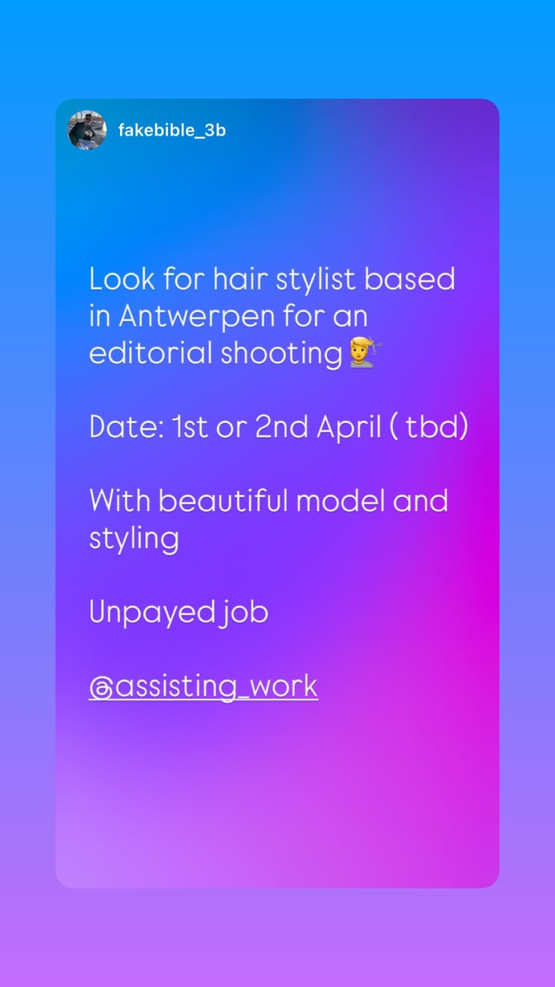 hair stylist wanted based in antwerp for an editorial shoot, working with a model and styling.