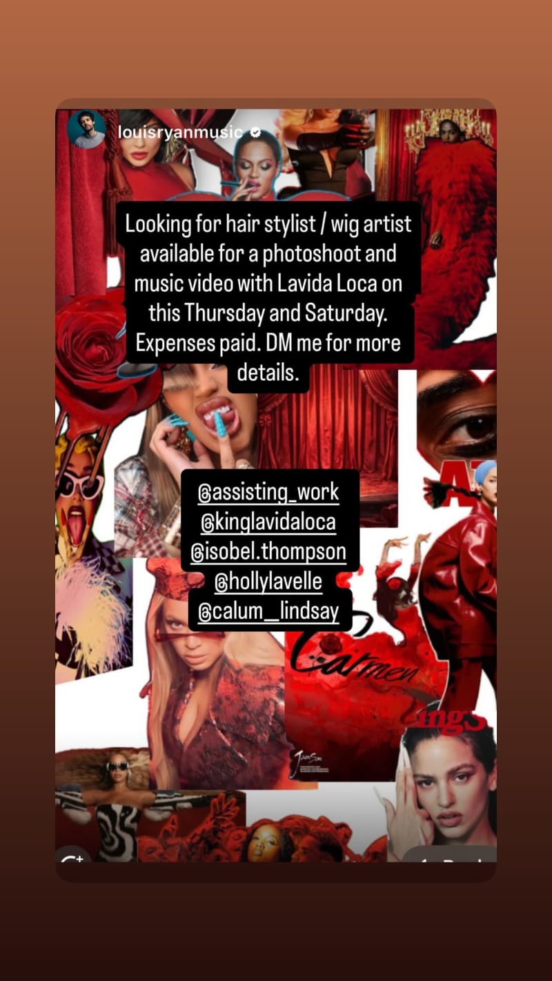 looking for a hair stylist / wig artist for a photoshoot and music video with lavida loca. available this thursday and saturday; dm for more details.