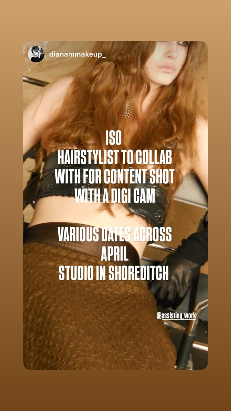 hairstylist wanted to collab on a content shoot with a digi cam. various dates across april in a studio in shoreditch.
