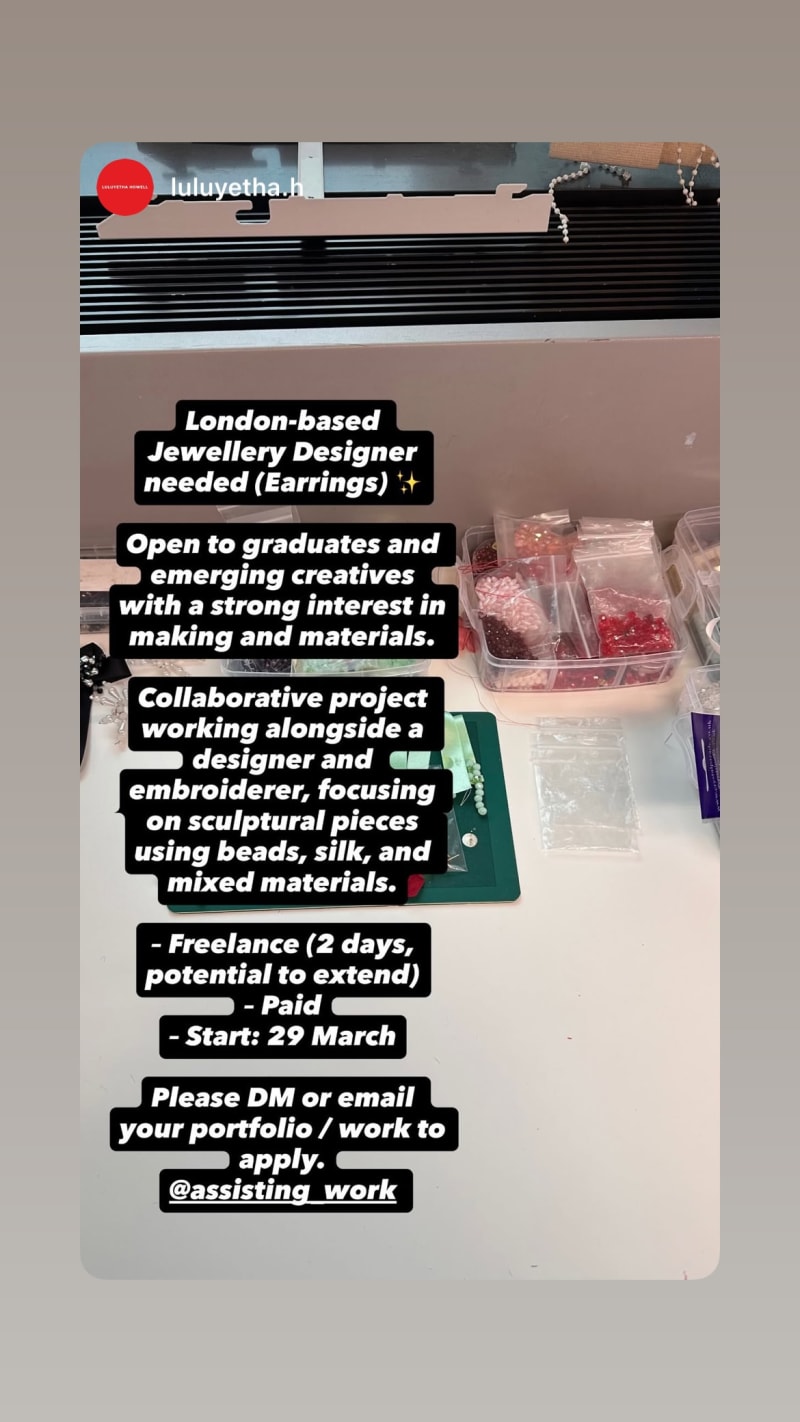london-based freelance jewellery designer needed for a collaborative project creating sculptural earring pieces using beads, silk, and mixed materials alongside a designer and embroiderer. open to graduates and emerging creatives with a strong interest in making and materials.