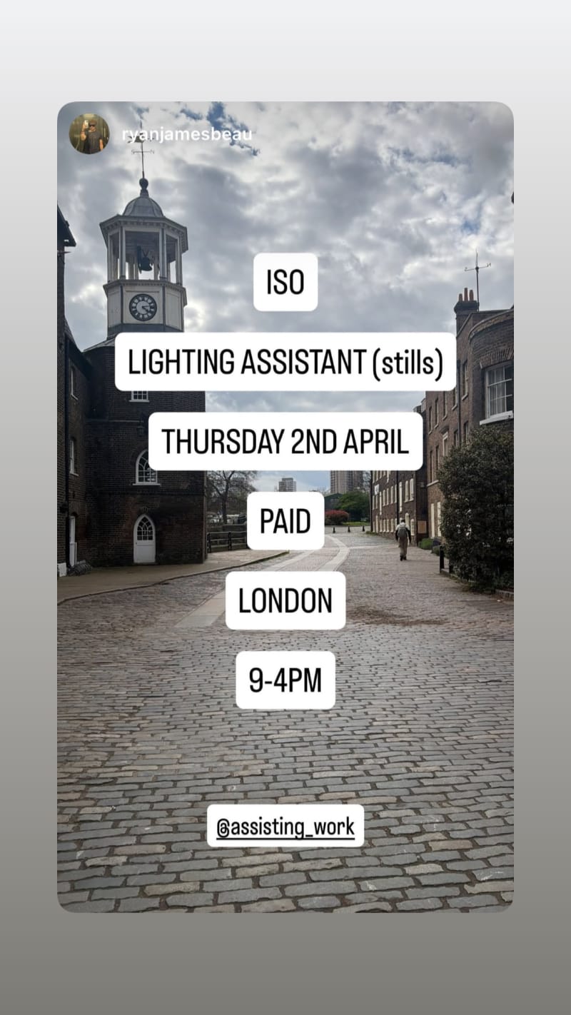 seeking a lighting assistant for a stills shoot in london from 9-4pm on thursday 2nd april. this is paid.