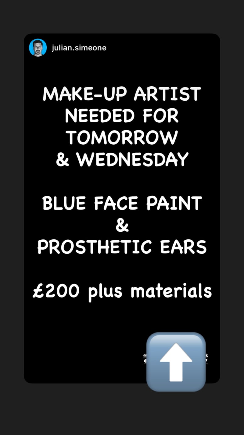 make-up artist needed for tomorrow and wednesday to do blue face paint and prosthetic ears. rate is £200 plus materials.