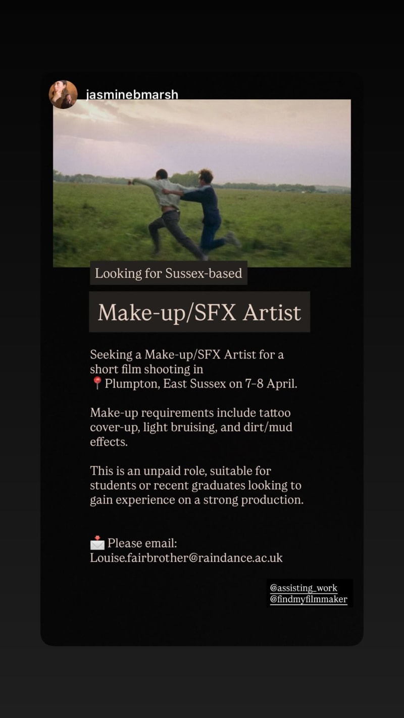 seeking a make-up/sfx artist for a short film shooting in plumpton, east sussex. make-up requirements include tattoo cover-up, light bruising, and dirt/mud effects.