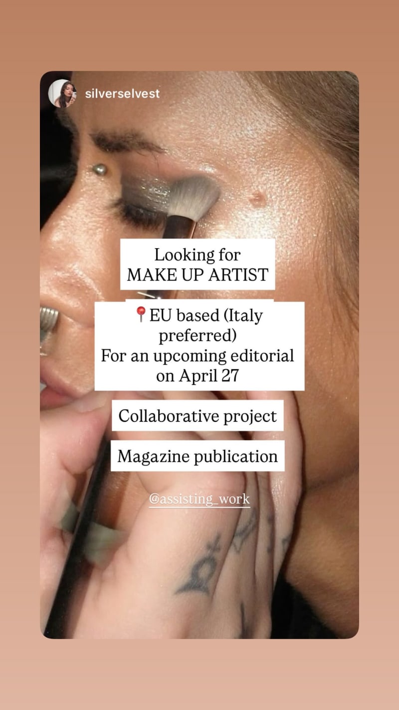 eu-based makeup artist wanted, preferably in italy, for an upcoming editorial on 27 april. collaborative project with magazine publication.