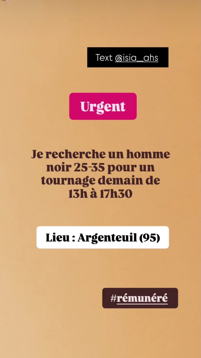 urgent: seeking a black man aged 25–35 for a filming shoot tomorrow 13:00–17:30 in argenteuil.