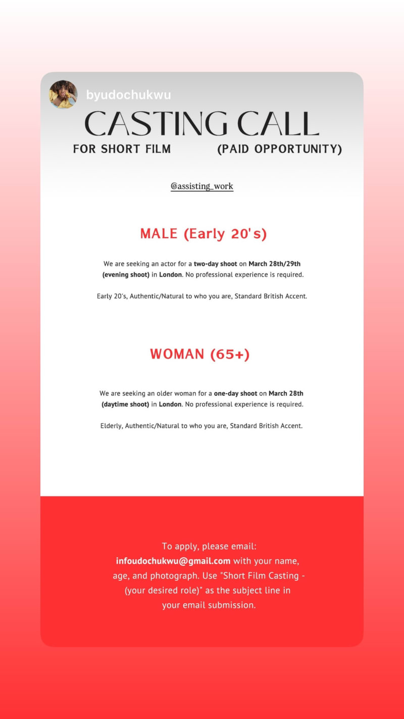 casting call for a paid short film seeking a male actor in their early 20s and an older woman actor aged 65+ for shoots in london. no professional experience is required; they want authentic/natural people with a standard british accent.