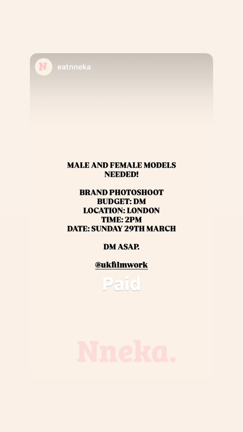 male and female models needed for a brand photoshoot in london at 2pm. dm asap for budget details.