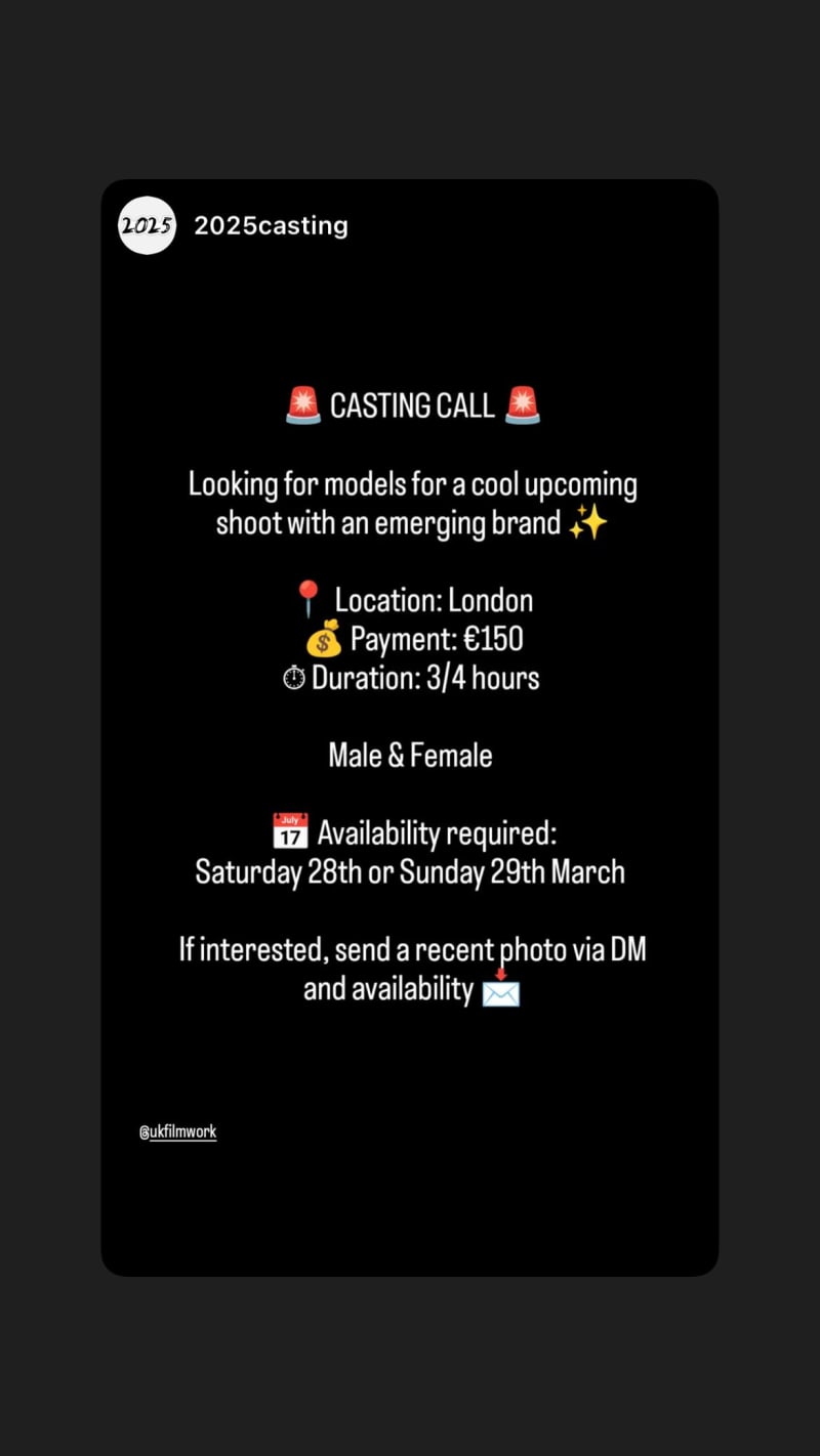 looking for models for an upcoming shoot with an emerging brand in london. shoot duration is 3 to 4 hours and applicants should send a recent photo by dm with availability.