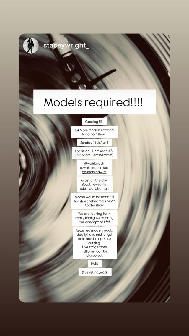 live stage hair show in amsterdam needing 4 male models with mid-length hair, open to cutting. short rehearsals prior; full brief provided.