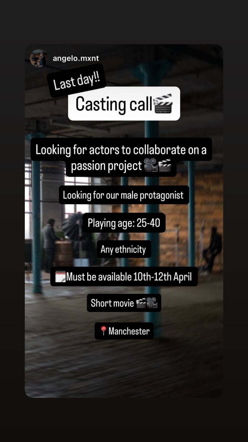 casting call for a short movie seeking a male protagonist to collaborate on a passion project. playing age is 25-40 and any ethnicity is welcome.
