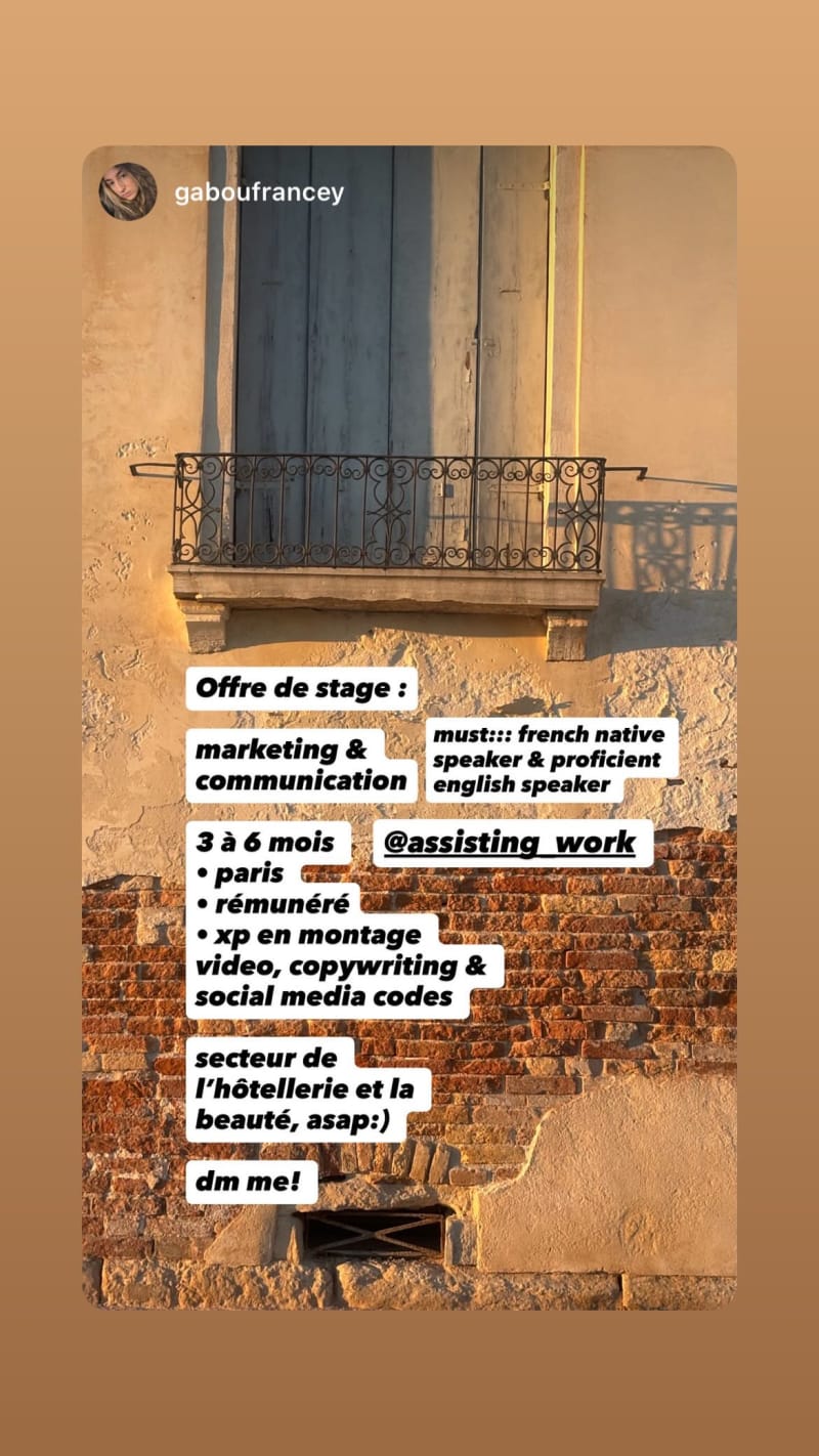 paid 3 to 6 month internship in marketing and communication for the hospitality and beauty sector. requires a native french speaker with proficient english and experience in video editing, copywriting and social media.