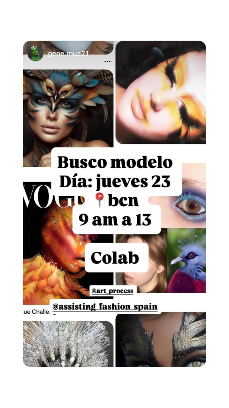seeking a model for a collaborative makeup and beauty look inspired by birds and fantasy visuals, taking place from 9 am to 1 pm.