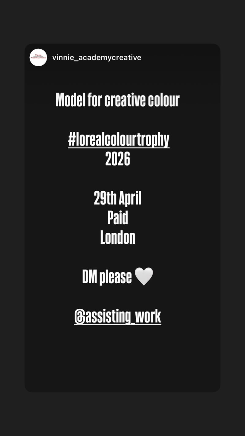 model wanted for a creative colour project for the #lorealcolourtrophy 2026. paid opportunity in london; dm to apply.