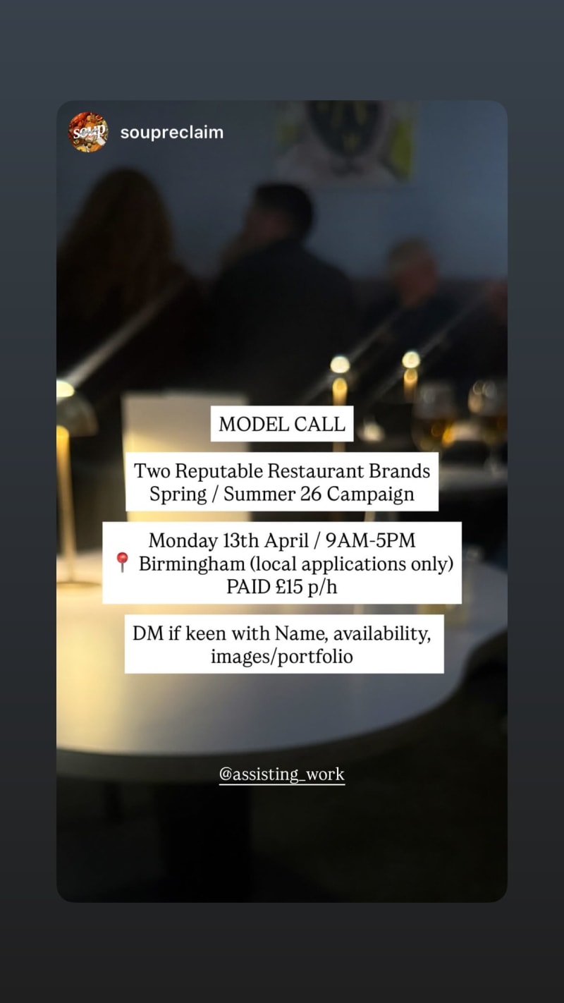 model call for two reputable restaurant brands' spring/summer 26 campaign. local applications only in birmingham; dm with name, availability, and images/portfolio.