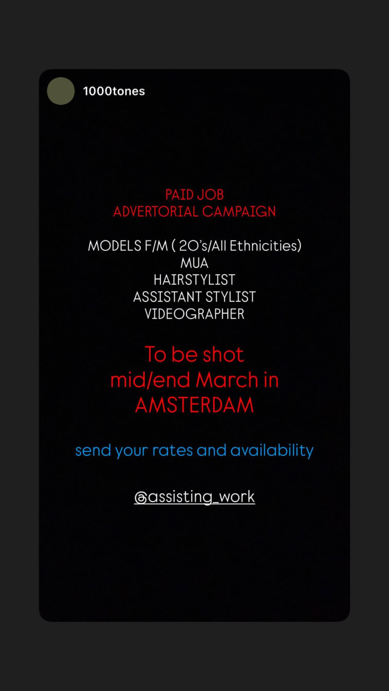 paid job for an advertorial campaign seeking models f/m in their 20s (all ethnicities), plus mua, hairstylist, assistant stylist and a videographer. shoot mid/end march in amsterdam; send rates and availability.