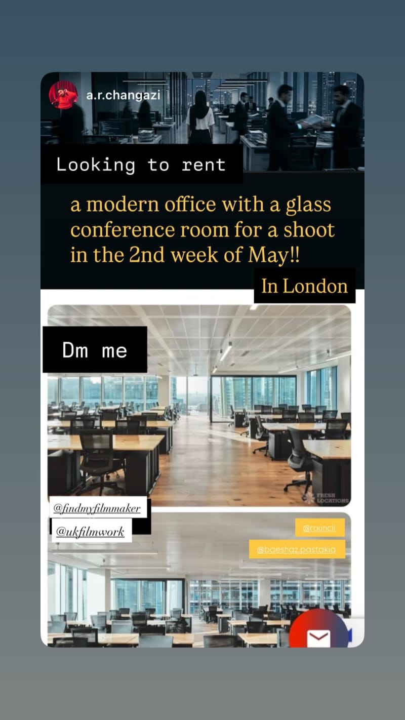 looking to rent a modern office with a glass conference room for a shoot in the 2nd week of may in london. dm me.