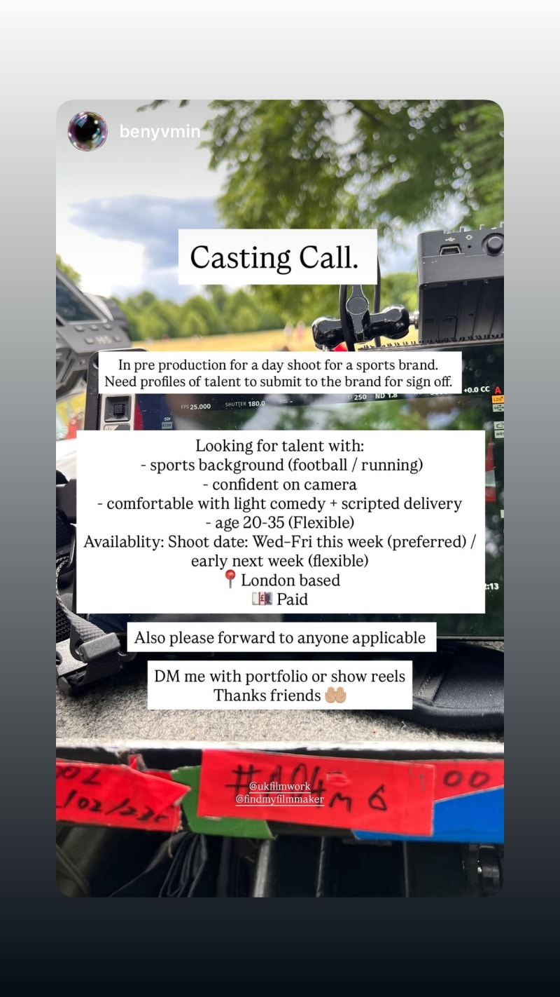day shoot for a sports brand seeking london-based talent with a sports background (football/running), confident on camera and comfortable with light comedy and scripted delivery. age range 20–35.