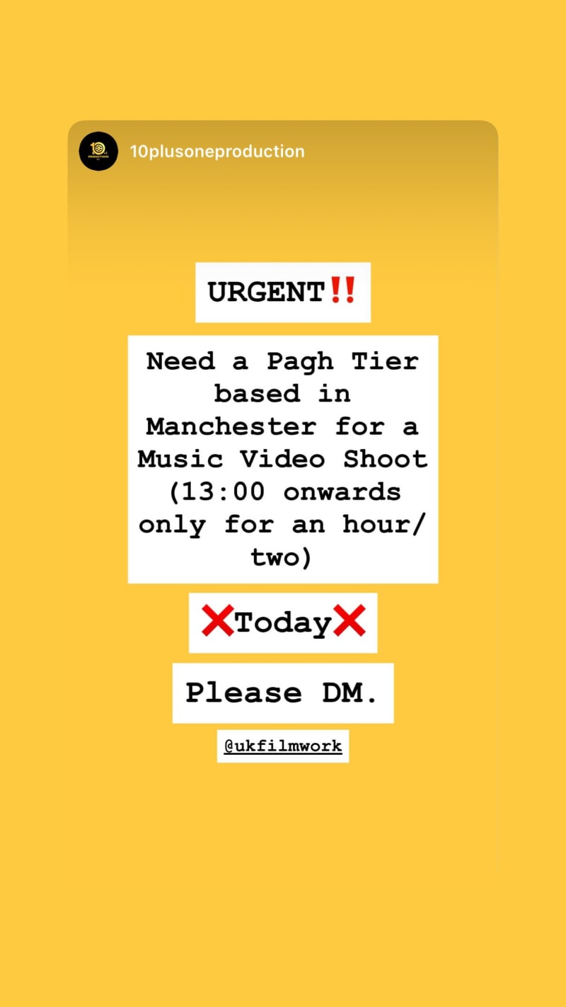 urgent call for a pagh tier based in manchester for a music video shoot today, from 13:00 onwards for one to two hours. please dm.