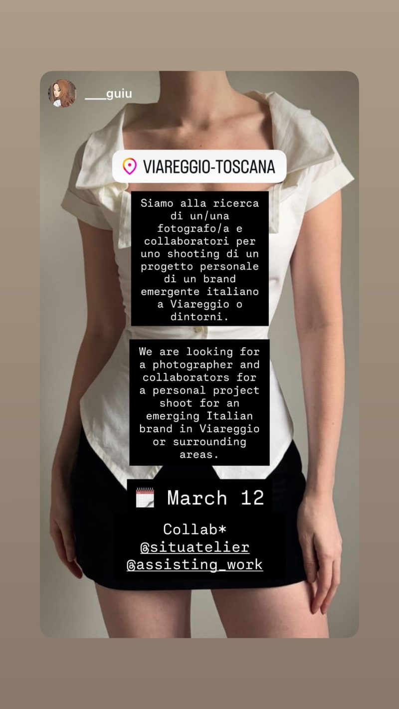 looking for a photographer and collaborators for a personal project shoot for an emerging italian brand in viareggio or surrounding areas. shoot on march 12.