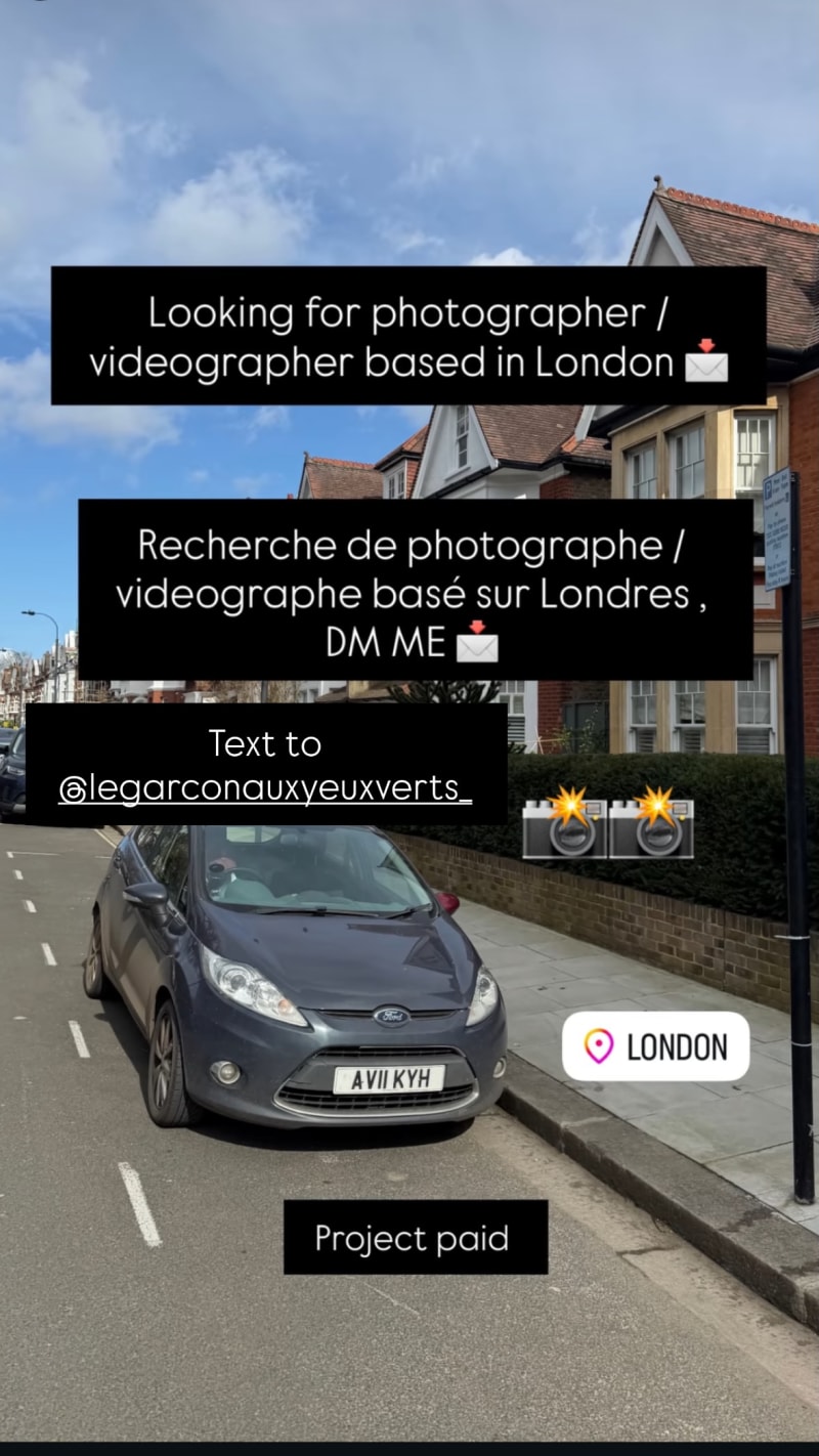 looking for a photographer or videographer based in london. dm @legarconauxyeuxverts_; project paid.