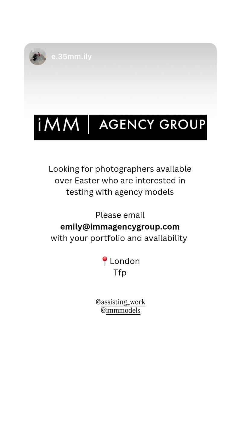 looking for photographers available over easter to test with agency models. email your portfolio and availability.