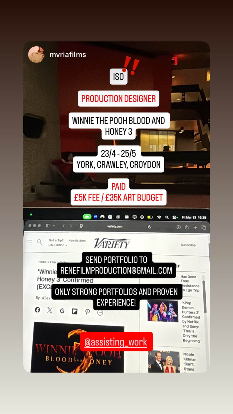 production designer needed for "winnie the pooh blood and honey 3". paid role with a £5k fee and £35k art budget; send portfolio to the listed email and strong portfolios with proven experience are requested.