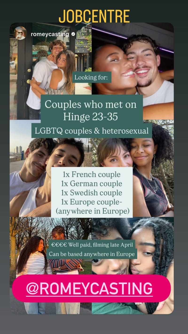 casting real couples who met on hinge, including lgbtq couples and heterosexual couples. seeking 1 french couple, 1 german couple, 1 swedish couple, and 1 europe-based couple for filming in late april.