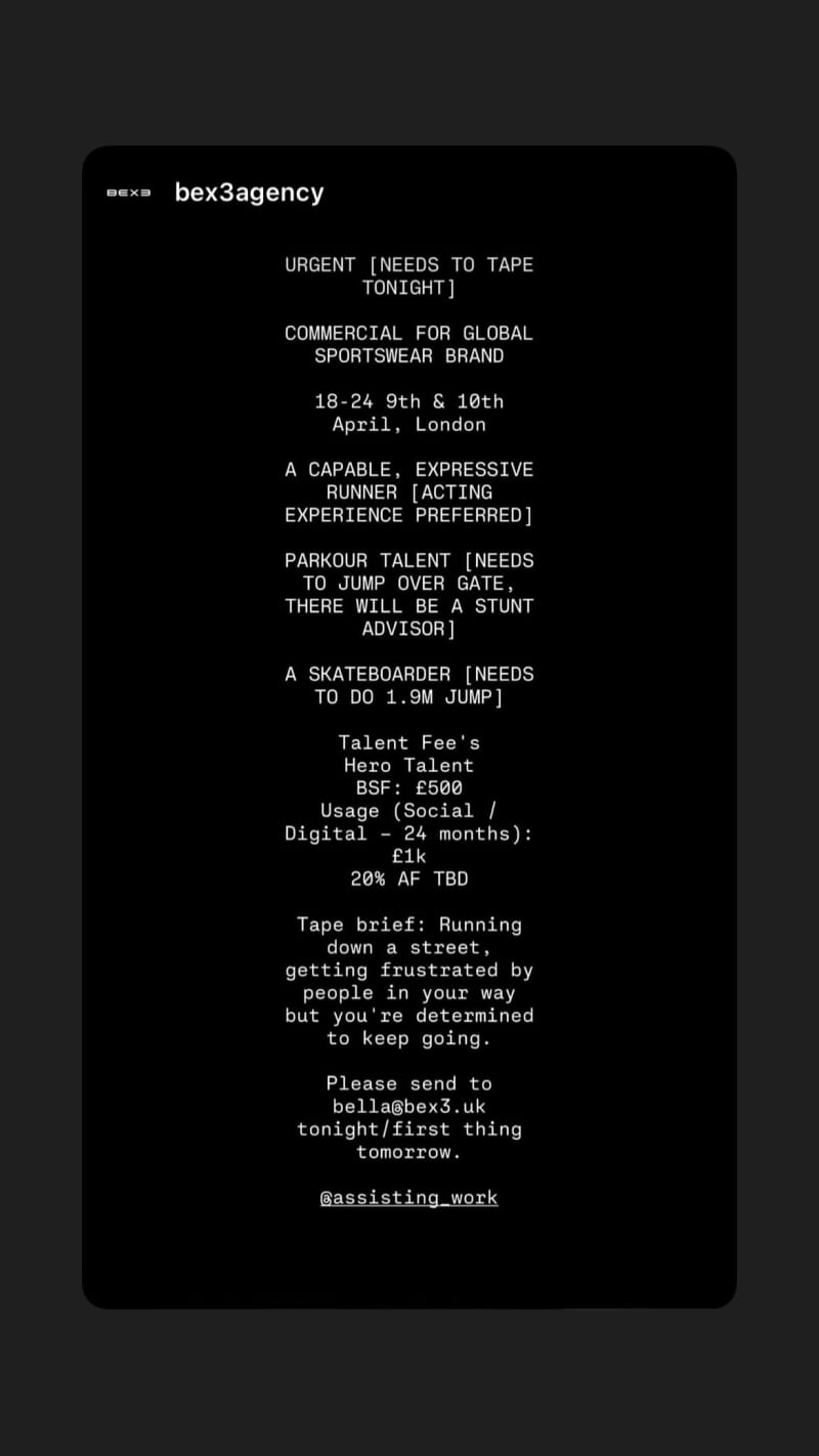 urgent commercial casting for a global sportswear brand seeking 18-24 talent in london. needs a capable, expressive runner, parkour talent who can jump a gate, and a skateboarder who can do a 1.9m jump.