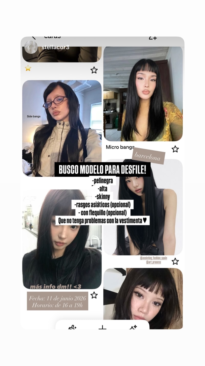 seeking a tall slim brunette model for a runway show in barcelona. asian features and bangs are optional, and they should be comfortable with the clothing.