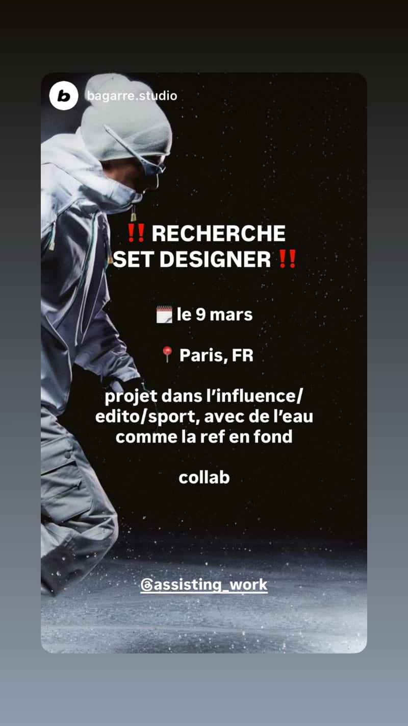 looking for a set designer for an influence/editorial/sport project with water as the background reference. paris, 9 march.