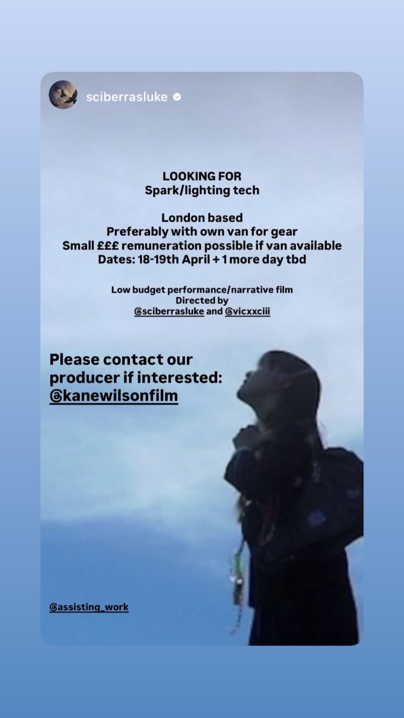 london-based spark/lighting tech wanted for a low budget performance/narrative film, preferably with own van for gear. small remuneration possible if a van is available.