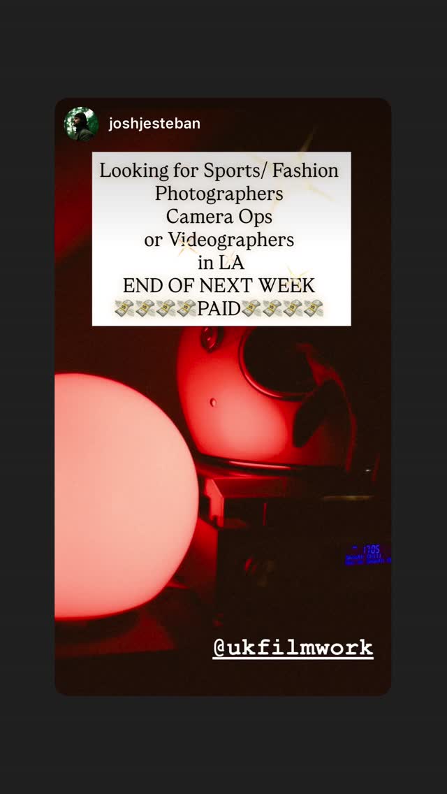 looking for sports/fashion photographers, camera ops or videographers for a paid job in los angeles at the end of next week.