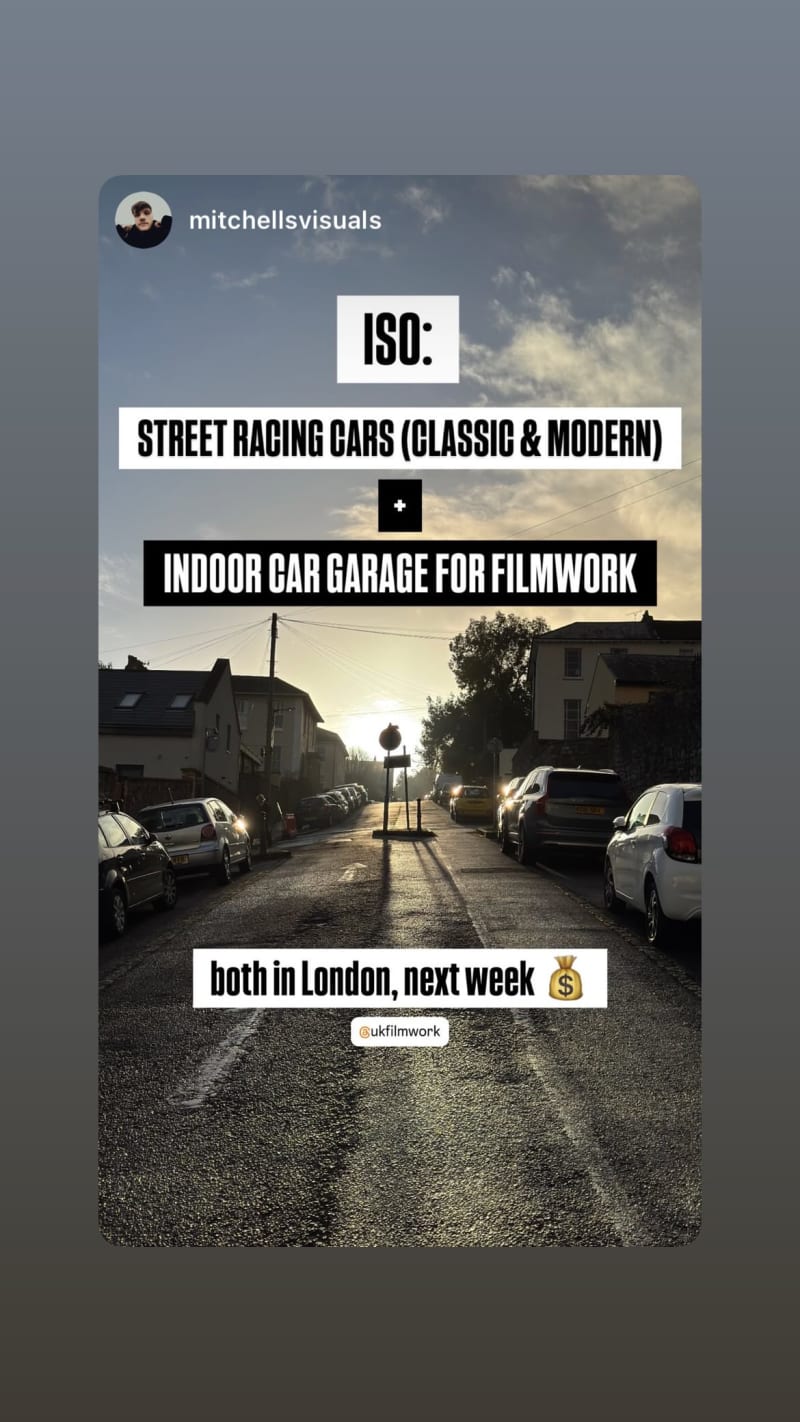 seeking classic and modern street racing cars plus an indoor car garage for filmwork in london next week.
