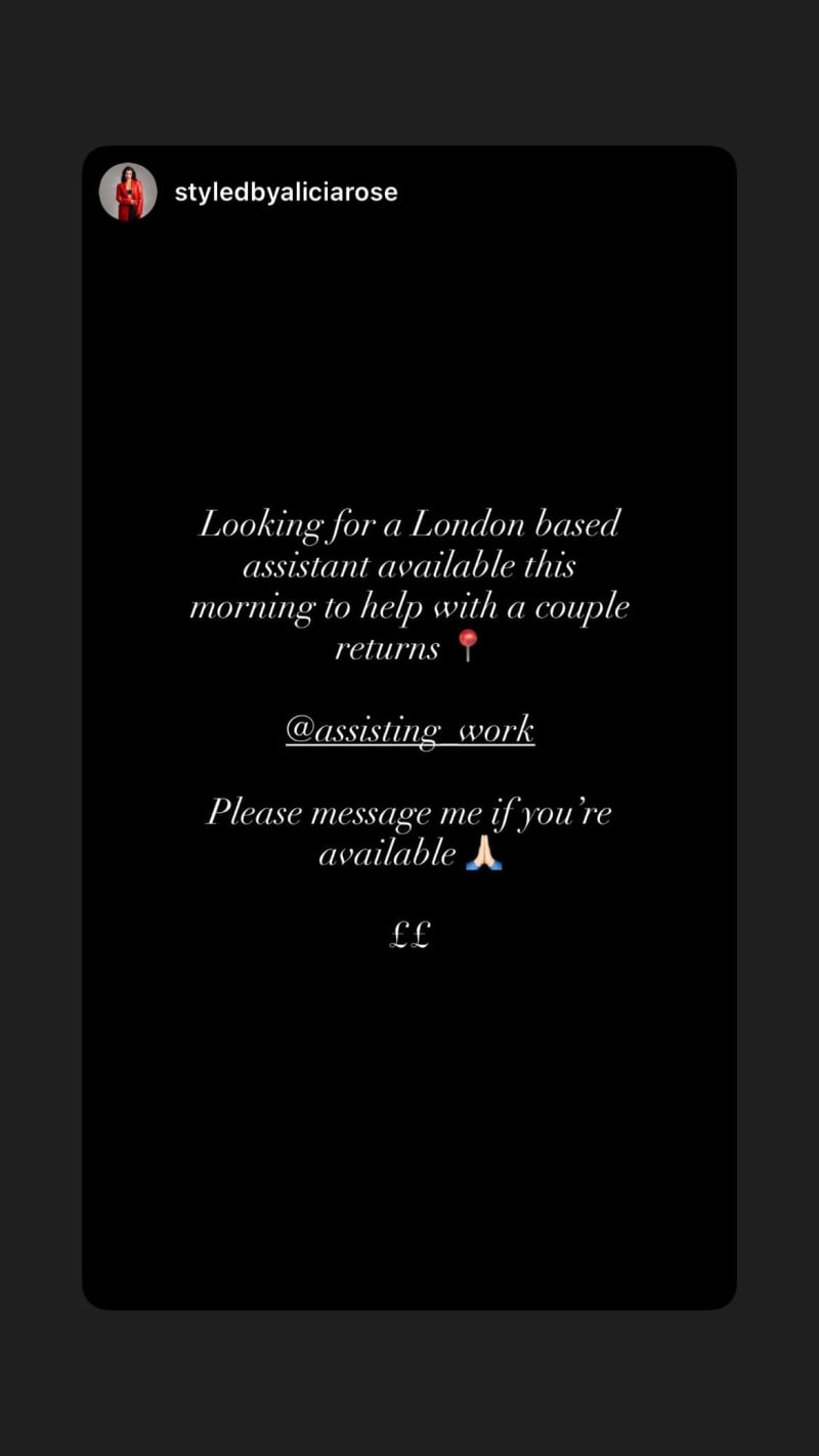 london-based styling assistant needed this morning to help with a couple of returns. message if available.