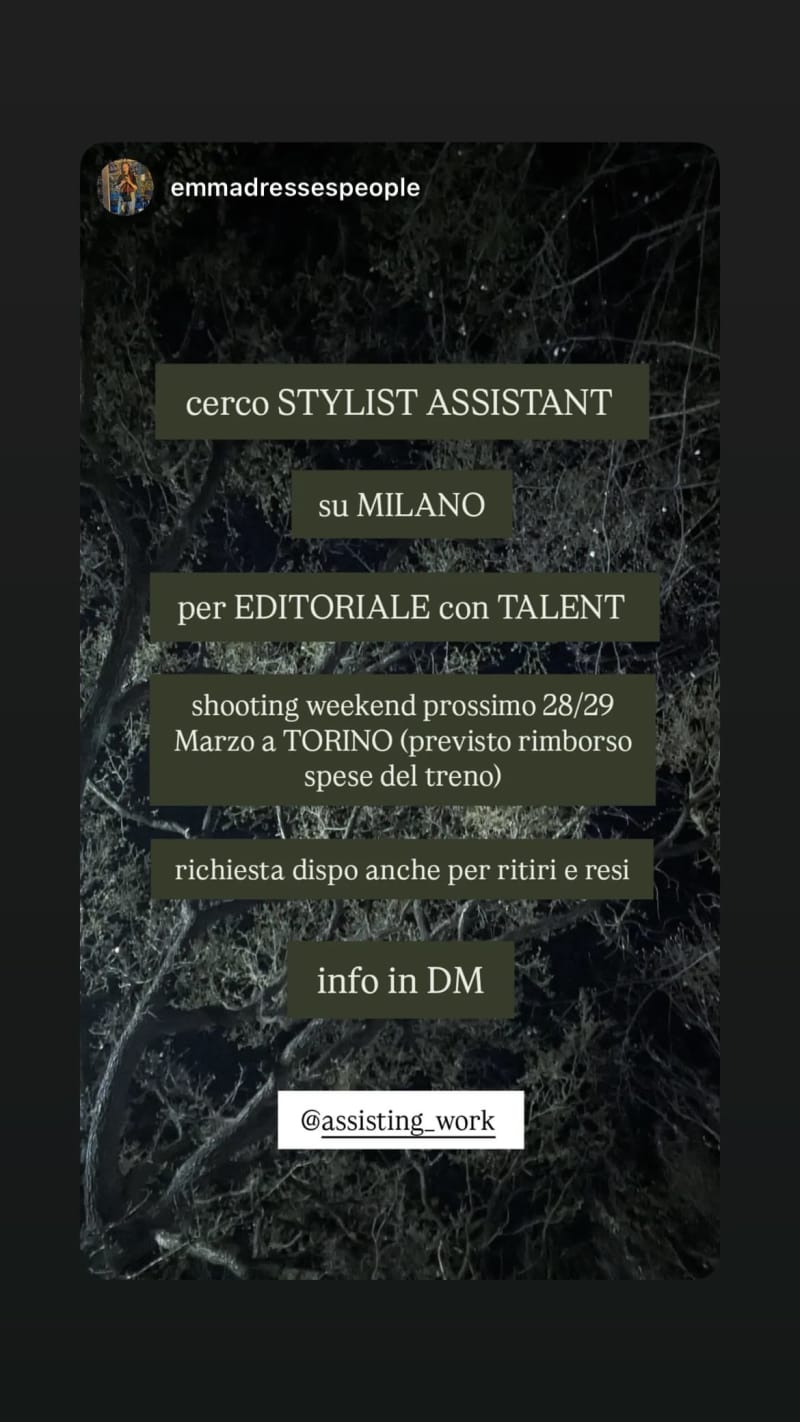 styling assistant wanted in milan for an editorial with talent. shoot next weekend 28/29 march in turin, with train expenses reimbursed.