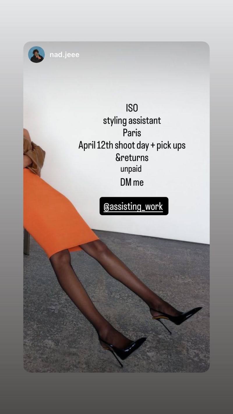 styling assistant needed for a paris shoot on april 12, including shoot day, pickups and returns. dm to apply.