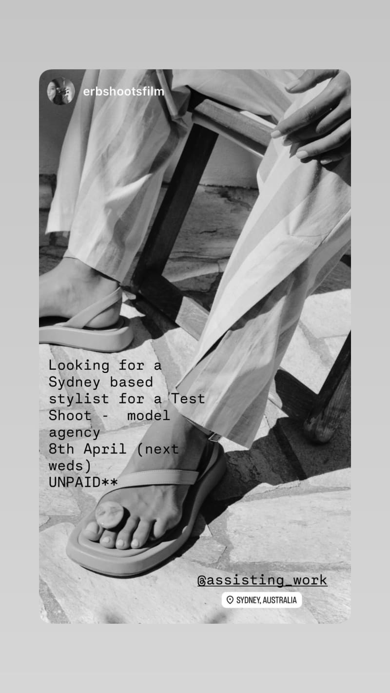 sydney-based stylist wanted for a test shoot with a model agency. the opportunity is unpaid.