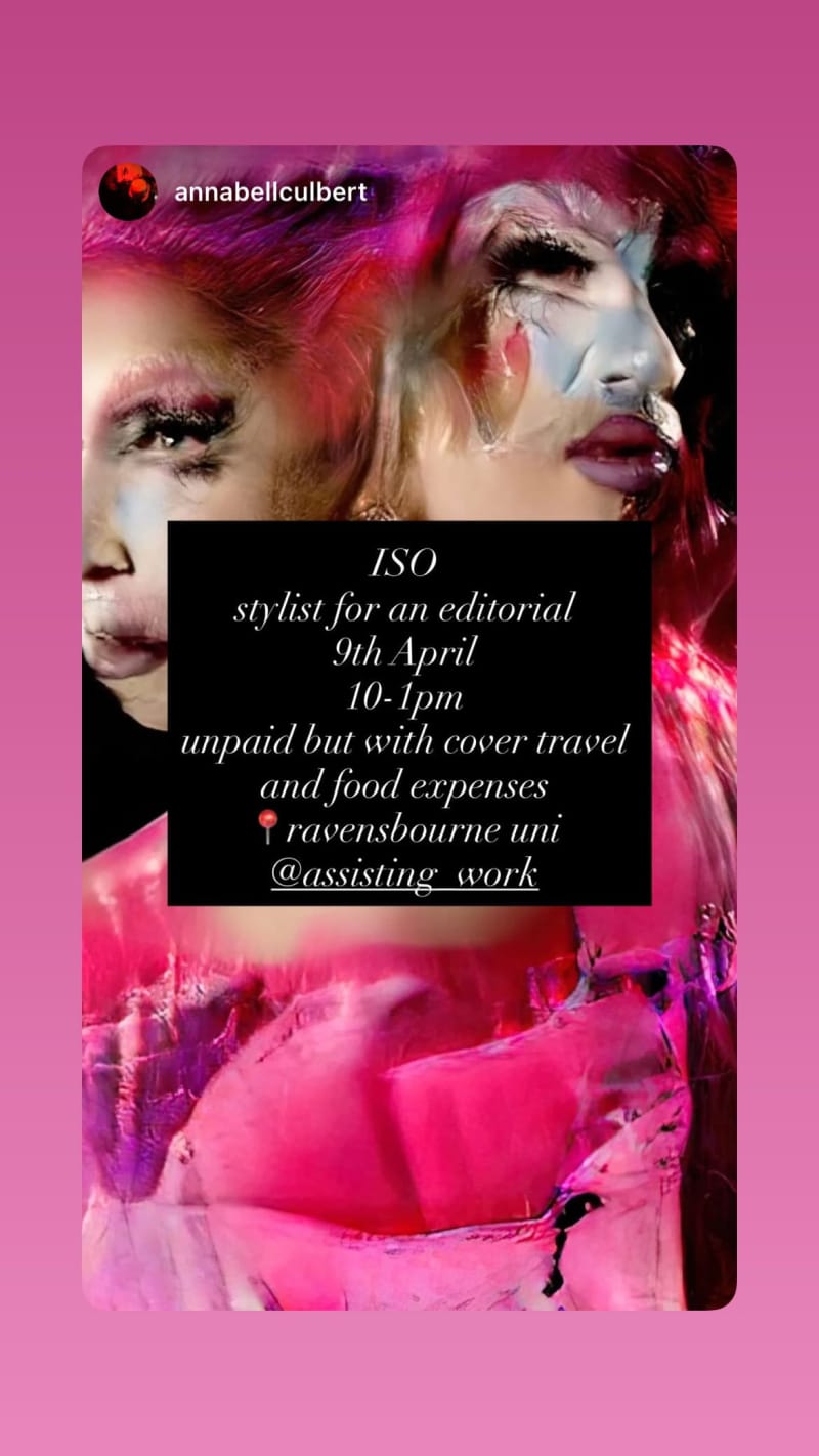 stylist needed for an editorial shoot at ravensbourne university, 10am-1pm. unpaid, but travel and food expenses are covered.