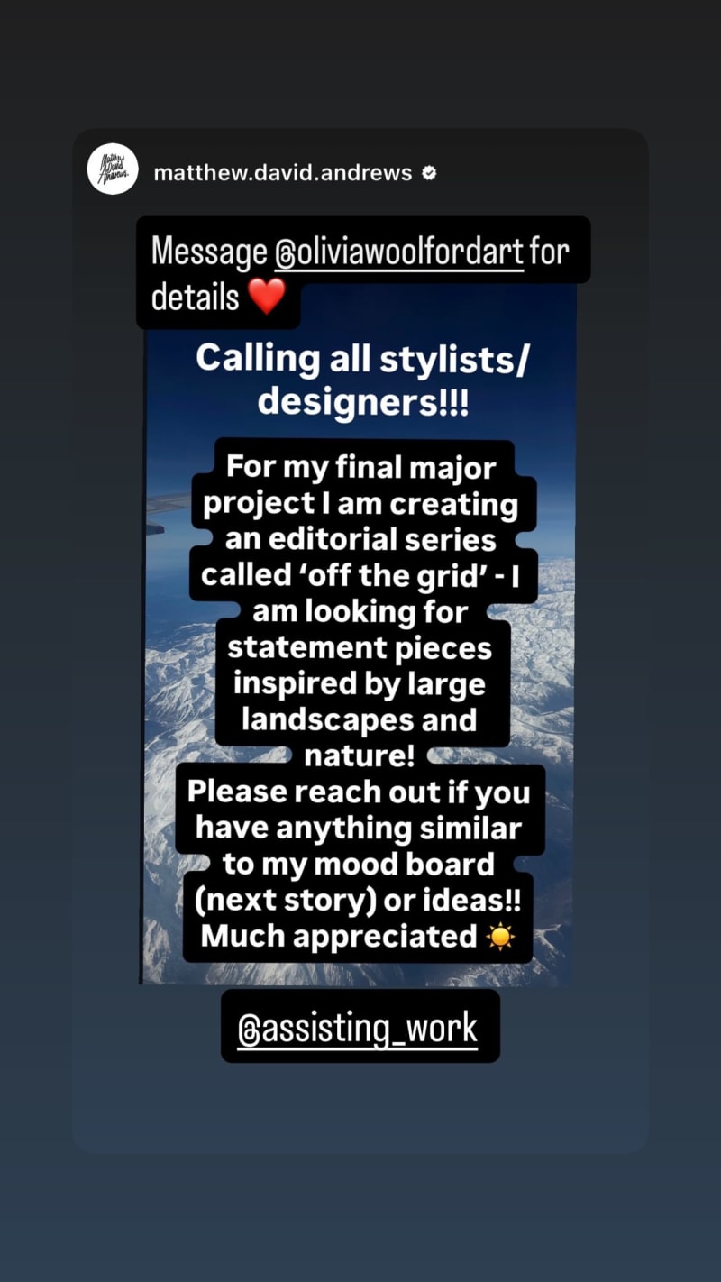 looking for stylists or designers for a final major project editorial series called 'off the grid', seeking statement pieces inspired by large landscapes and nature. asks people to reach out if they have similar work to the mood board or ideas.