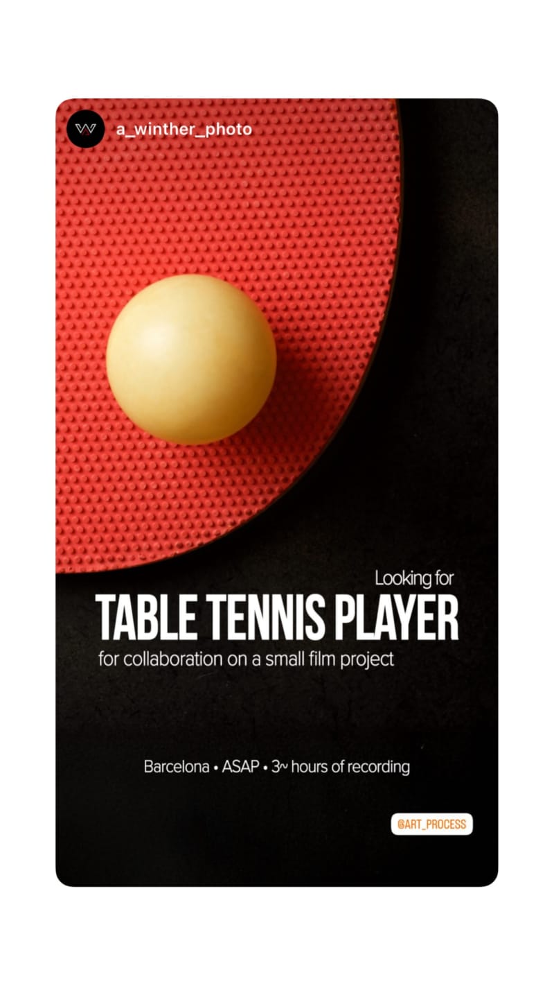 looking for a table tennis player for a collaboration on a small film project. recording is in barcelona and lasts around 3 hours.