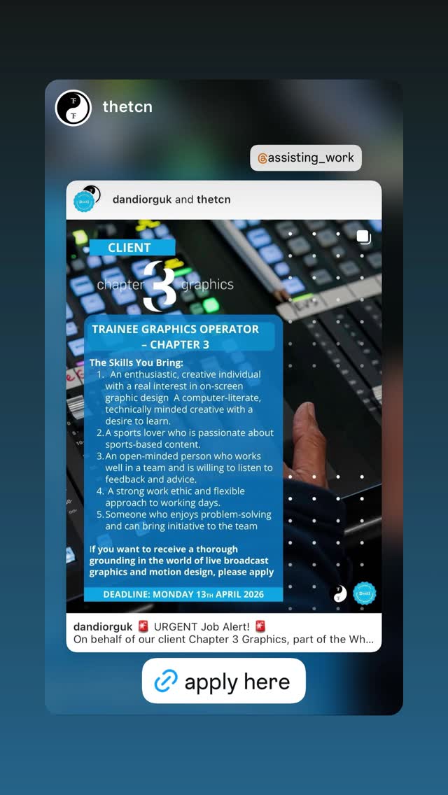 entry-level role for a creative individual interested in on-screen graphic design, live broadcast graphics and motion design. suited to someone computer-literate, sports-focused, collaborative and keen to learn.