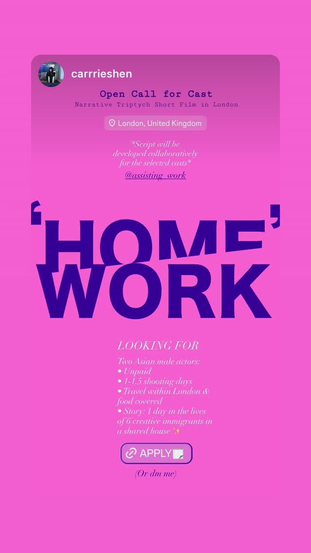 open call for cast for the narrative triptych short film 'home'work' in london. looking for two asian male actors for a story about one day in the lives of six creative immigrants in a shared house.