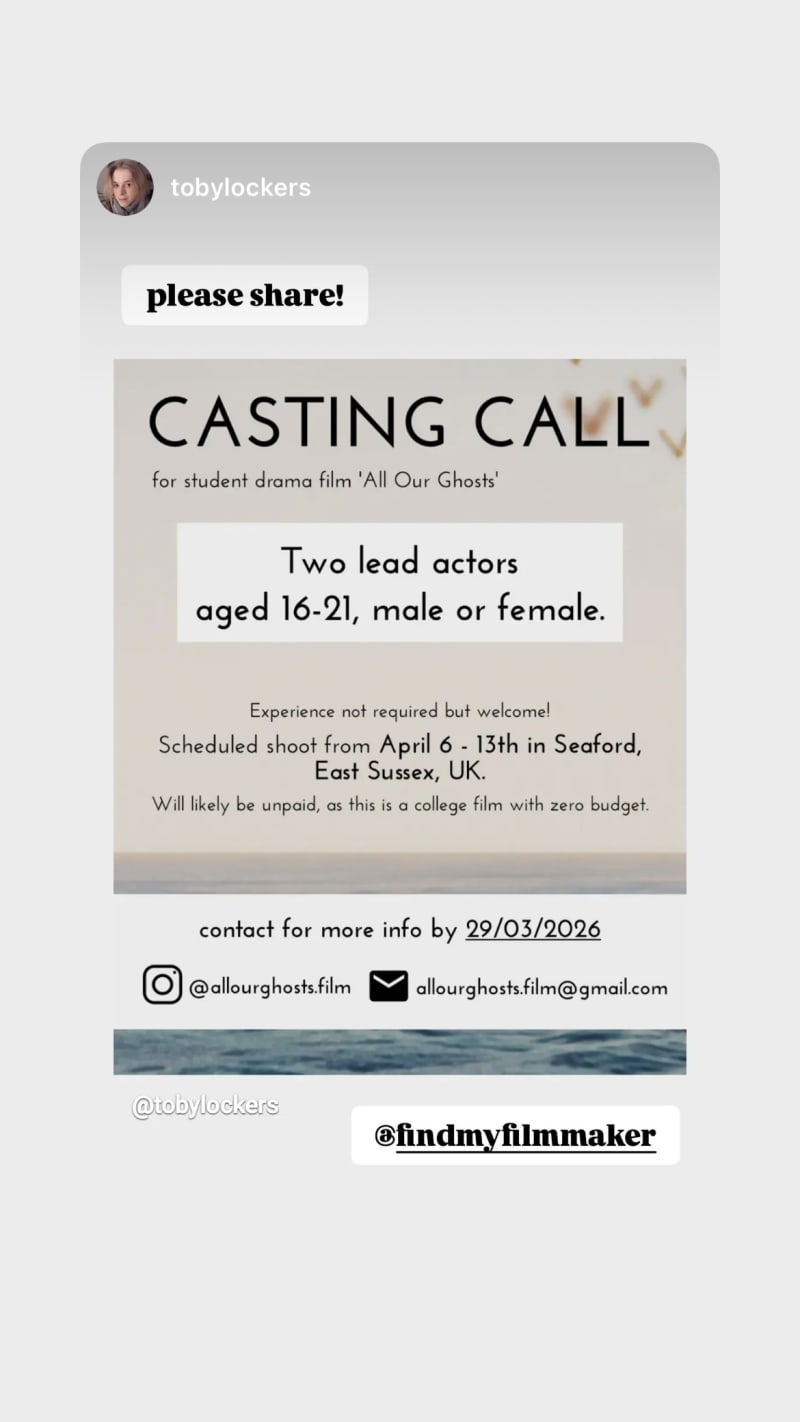 casting call for student drama film 'all our ghosts' seeking two lead actors aged 16-21. experience not required but welcome; scheduled shoot runs 06/04/26 to 13/04/26 in seaford, east sussex.